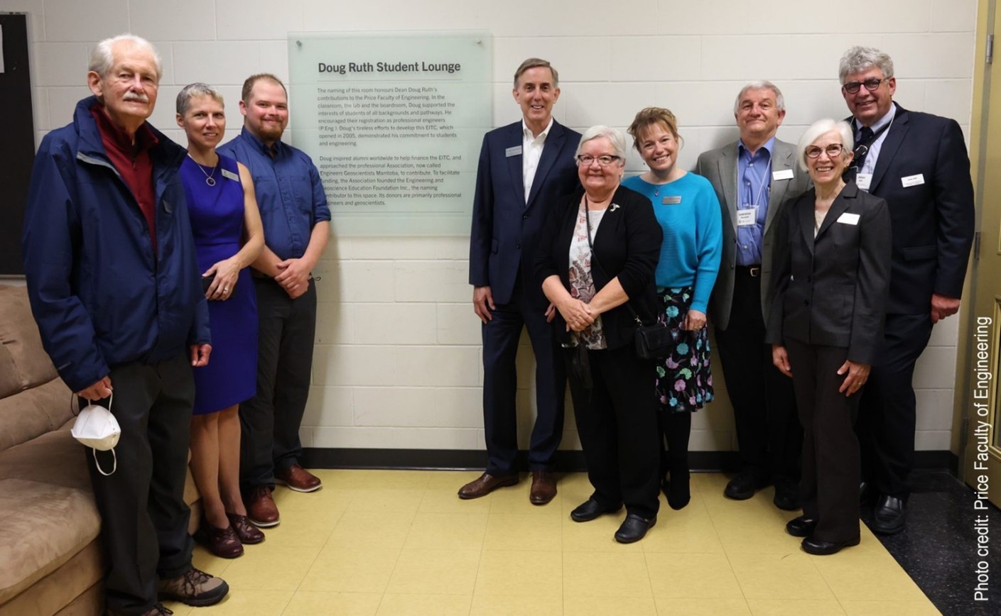 Doug Ruth Student Lounge plaque Dedication Ceremony L to R - Dave Ennis, Director; Dr. Marcia Friesen, Dean, Price Faculty of Engineering and ex-officio Director; Dawson Switzer, Senior Stick; Dr. John (Jay) Doering, Director; Bev Ruth; Amber Anderson Skrabek, Director; Lawrence Ferchoff, Director; Nirdosh Ganske, EGEF President; Allan Silk, EngGeoMB President and Board Liaison
