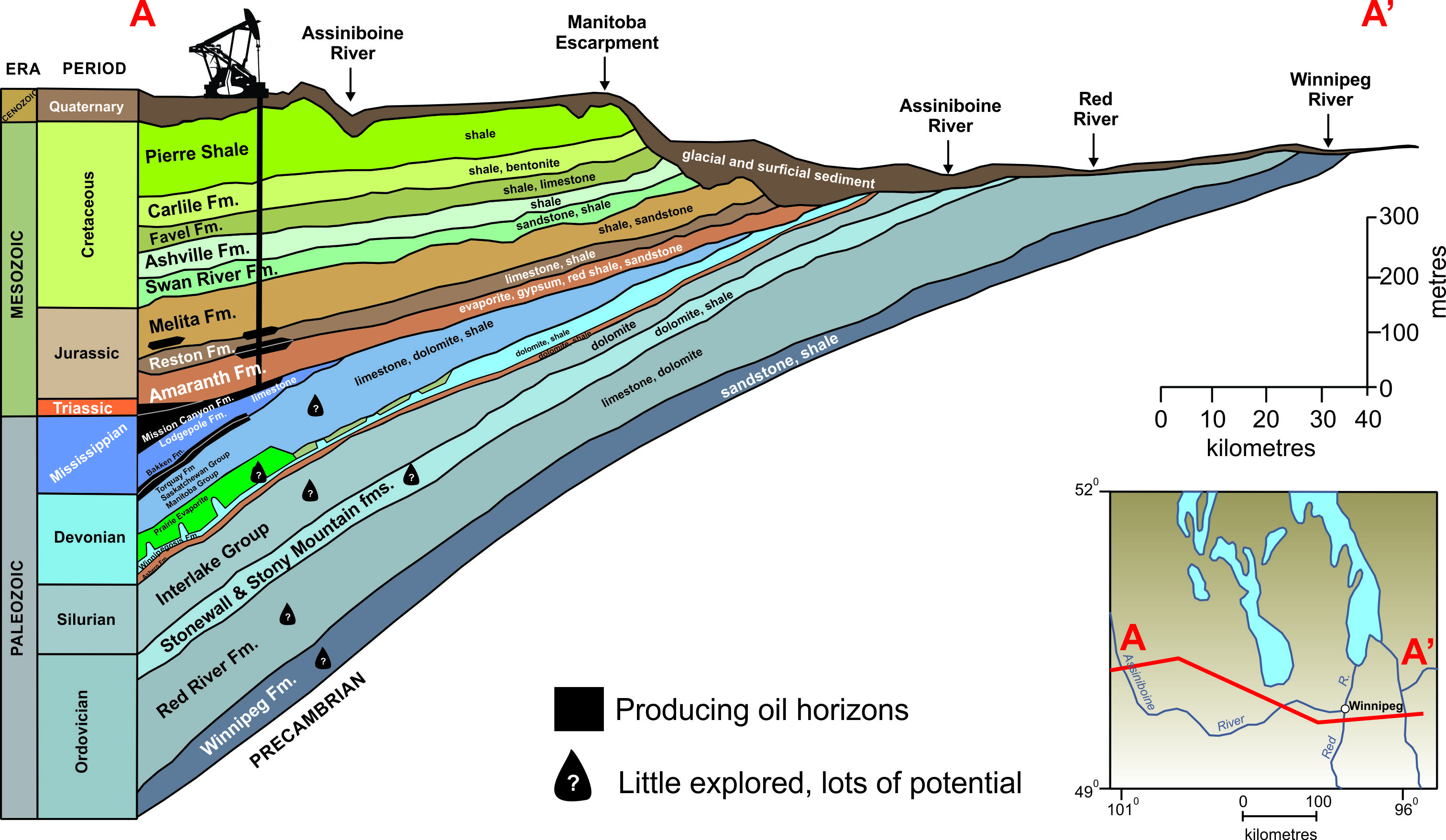 Figure 4: West to east cross-section of the Western Canada Sedimentary Basin in southern Manitoba. Formations with known oil pools are indicated with black infill; formations with no oil production but have good potential are indicated with an oil droplet. Province of Manitoba