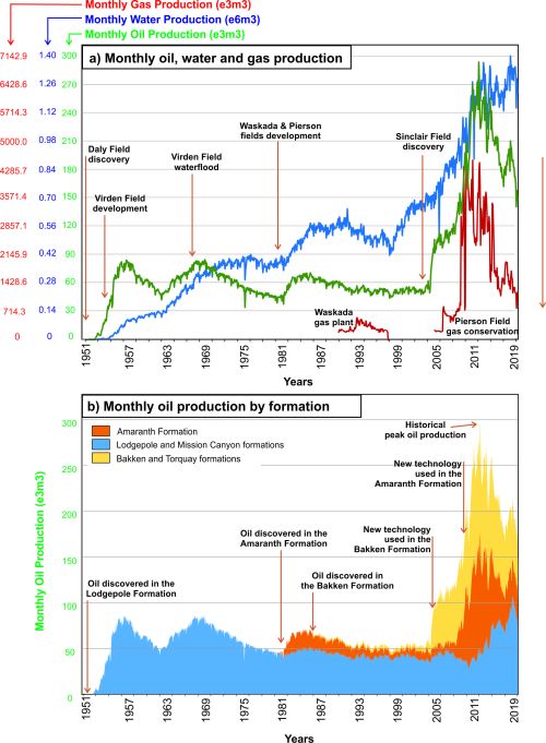Figure 5 shows the trends of drilling and production in Manitoba, as well as the evolution of producing formations related to technological advancements and discoveries. The oil production from Lodgepole and Mission Canyon formations accounted for most of Manitoba’s oil until 2005, when new drilling and fracking techniques were used in the Bakken then in the Amaranth. Reservoirs in the Amaranth Formation contributed small volumes, but did not become a significant contributor to the cumulative production until the full development of the Waskada and Pierson fields in the early 1980s, corresponding to Manitoba’s second oil boom. Production from the Bakken Formation started in 1983, but took off in great volumes with the discovery of the Sinclair Field (now amalgamated with the Daly Field, and called the Daly Sinclair Field) in 2005. This discovery correlates to the biggest oil boom in Manitoba’s history.