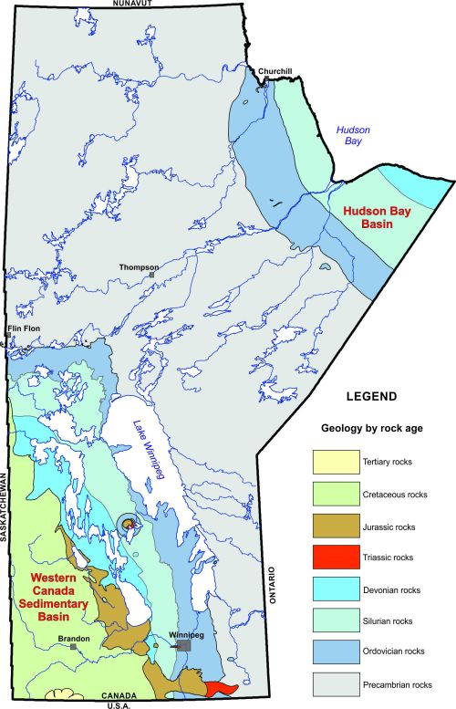 Manitoba’s two sedimentary basins—Western Canada Sedimentary Basin and Hudson Bay Basin—are known as intracratonic basins which are formed when seawater rises and floods the continent allowing sediment to accumulate within areas of subsidence or depression in the crustal Precambrian basement rocks. The Western Canada Sedimentary Basin occurs in the southwest corner of Manitoba containing Paleozoic-to-Cretaceous-age sedimentary rocks. The Hudson Bay Basin, located in the northeast, consists of early Paleozoic-age sedimentary rocks. During the Paleozoic, these two basins were connected and part of a continuous, continent-wide interior seaway that extended from modern-day Hudson Bay to the Gulf of Mexico. During the Silurian Period, upwelling (bulging) of the Precambrian bedrock formed a broad northwest-southeast trending arch called the Severn Arch that separated the two into distinct basins.