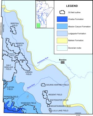Manitoba’s oil patch occurs exclusively in the extreme southwest corner of the province, within the Willison Basin. There are 13 oil fields in total (Figure 3) and approximately 245 active oil pools in Manitoba (oil fields are groupings of one or more oil pools, and oil pools are groupings of one or more producing wells). Currently, oil production in Manitoba comes from the Torquay, Bakken, Lodgepole, Mission Canyon, Amaranth, Reston and Melita formations. These formations occur in the middle of the thick sedimentary package in the basin (Figure 4), producing oil from depths ranging from 450 to 1200 m.