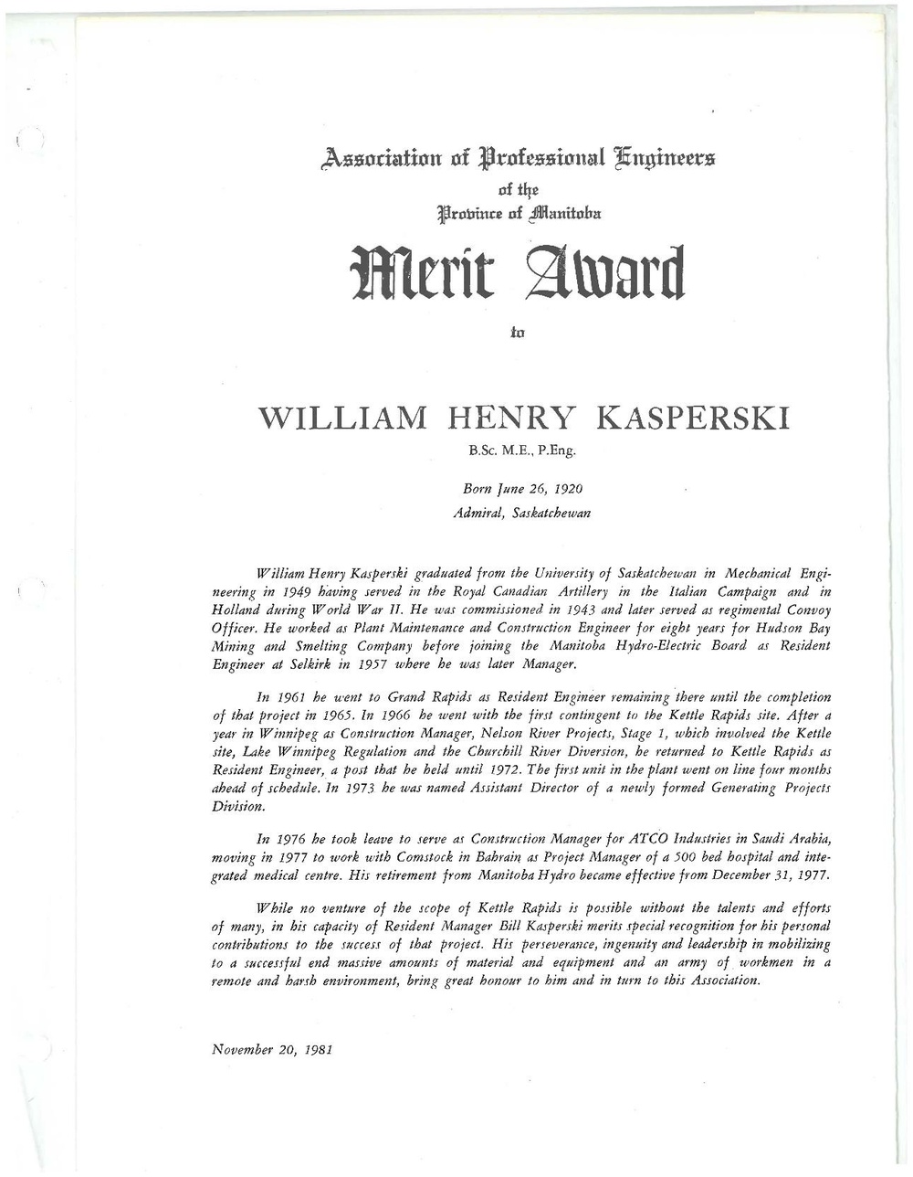 Frank Fowler became registered with the Association of Professional Engineers of Manitoba (now EGM) on December 17, 1956. He served on Council for five years and in 1967 he was elected Vice-President and in 1968 was elected President after the then President resigned. Frank was a member of the Premises Committee for 5 years, one year as Chairman, the Registration Procedures Committee for 2 years, the Engineers-Architects Committee for 1 year, and the Nominating Committee for 3 years. He served on the Bulletin Committee for 3 years, one year as Chairman, and the onerous Practice and Ethics Committee for 9 years, one year as Chairman. Frank received the APEM Outstanding Service Award on November 23, 1979. Associated Activities