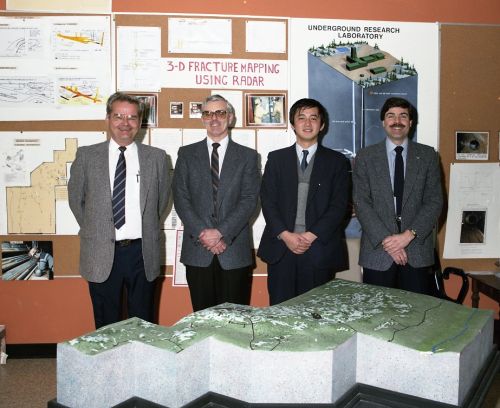 • 3-D fracture mapping at URL Radar Survey scientist Art Hollaway, Gary Simmons, Japanese visitor and Cliff Davison, Photo Courtesy of Ganpat Lodha collection.