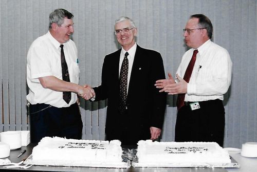 • Gary Simmons with Colin Allen and Ken Dormuth on completing 30 years of service at URL, Photo Courtesy of Ganpat Lodha collection.