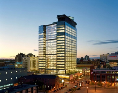Manitoba Hydro Place (MHP) is the head office of Manitoba Hydro, the electric power and natural gas utility in Manitoba, Canada. Located in Winnipeg and officially opened in September 2009, it was the first LEED Platinum office tower in Canada and among the most efficient office towers in North America. By using an integrated design process, building energy use was minimized for Manitoba’s climate. Consuming 88 kWh/m2, Manitoba Hydro Place uses 60% less energy than the Model National Energy Code for Buildings and 73% less energy than the standard office tower in Winnipeg. MHP houses two thousand employees on 21 floors. Unique attributes of this building include North America’s largest solar chimney providing 100% fresh air at all times, Manitoba’s largest geothermal heating and cooling system, and the world’s first “reversed” double façade optimized for a cold climate.